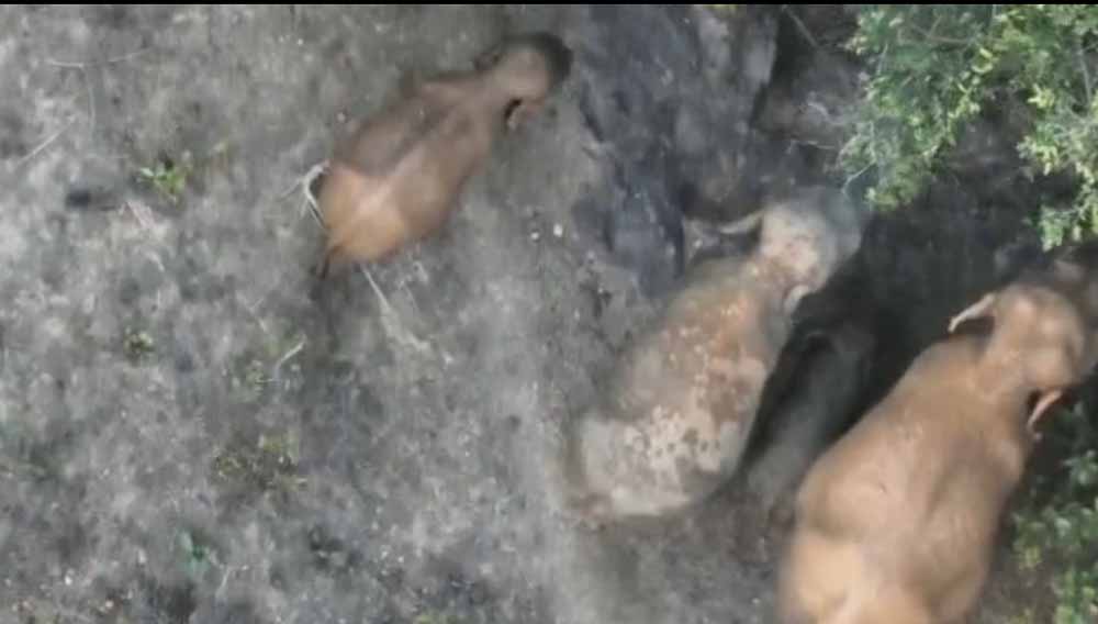 रायगढ़ जिले के जंगल से हाथियों के दल का ड्रोन कैमरे का एक शानदार तस्वीर सामने आई है. 11 हाथियों के दल में दो नन्हे शावक हैं जो अपनी मां के साथ जंगलों में घूमते नजर आ रहे हैं. हाथियों का यह दल छाल रेंज के कुडेकेला परिसर के गूडाघाट डेम किनारे विचरण कर रहा था. वीडियो में देखा जा सकता है कि मादा हाथी अपने शावक को सुरक्षित घेरे में रखते हुए जंगल में आगे बढ़ते नजर आ रही है. बताया जा रहा है कि दोनों हाथी शावक की उम्र करीब 6 महीने के आसपास है.