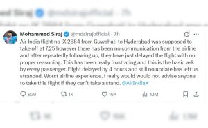 “गुवाहाटी से हैदराबाद जाने वाली एयर इंडिया की उड़ान संख्या IX 2884 को 7:25 पर उड़ान भरनी थी। मगर एयरलाइन की तरफ से कोई सूचना नहीं मिली है और बार-बार संपर्क करने के बावजूद उन्होंने बिना किसी उचित कारण के उड़ान में देरी की है… सबसे खराब अनुभव।” — मोहम्मद सिराज