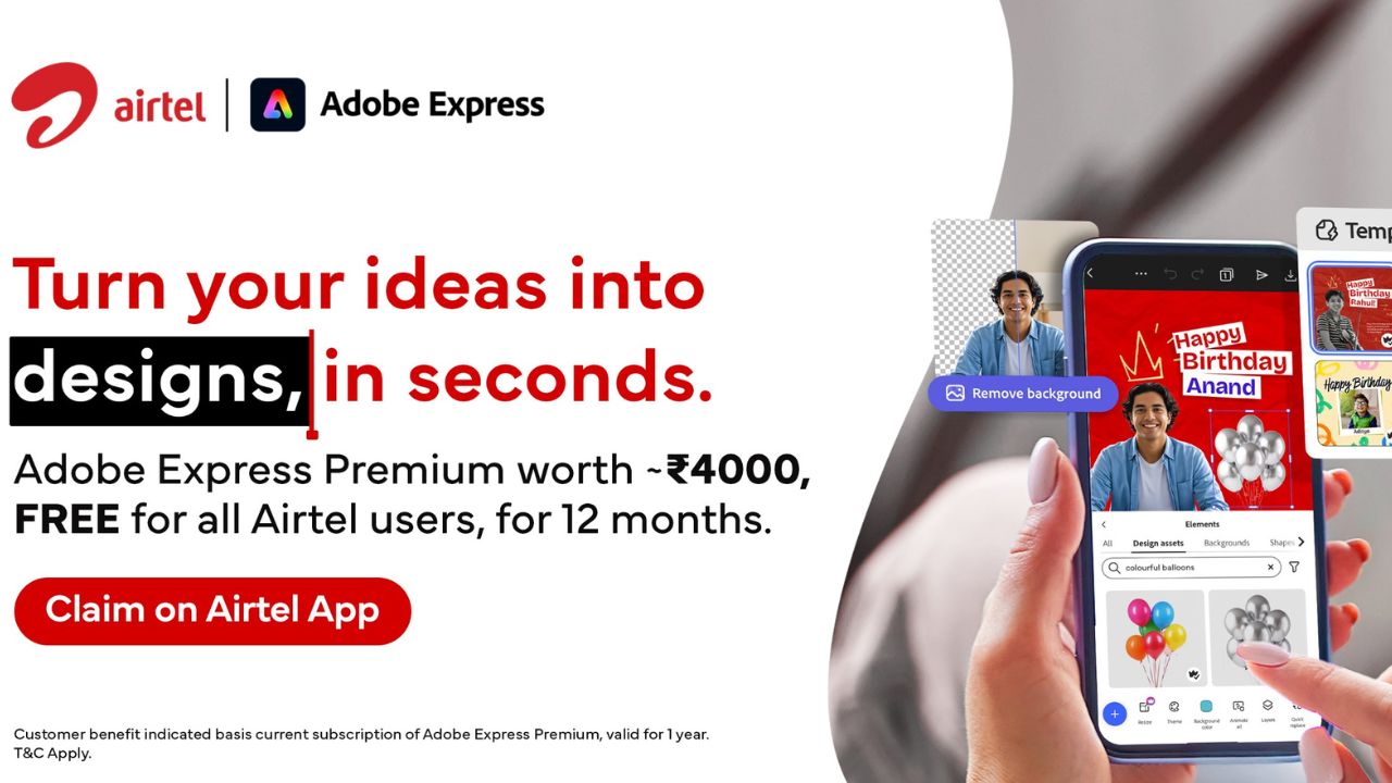 एडोबी एक्सप्रेस एक एआई आधारित डिजाइन टूल है जो सोशल मीडिया कंटेंट, वीडियो और मार्केटिंग सामग्री बनाने में मदद करता है। एयरटेल के मोबाइल, वाईफाई और डीटीएच ग्राहक एयरटेल थैंक्स ऐप पर लॉग इन करके इसका उपयोग कर सकते हैं। इसके लिए क्रेडिट कार्ड की जरूरत नहीं होगी।