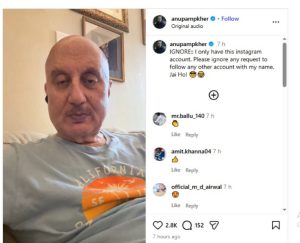 अनुपम खेर ने तुरंत एक वीडियो संदेश जारी कर स्पष्ट किया कि उनका केवल एक ही आधिकारिक इंस्टाग्राम अकाउंट है। उन्होंने कैप्शन में लिखा, “कृपया ध्यान दें, मेरा केवल यही इंस्टाग्राम अकाउंट है। मेरे नाम से जुड़े किसी भी अन्य अकाउंट को फॉलो करने के अनुरोध को अनदेखा करें।”
