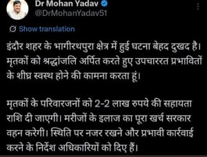 मुख्यमंत्री मोहन यादव ने एक्स पर ट्वीट कर मृतकों को श्रद्धांजलि दी है। साथ ही मृतकों के परिवार को 2-2 लाख रूपए सहायता राशि देने की घोषणा की है।