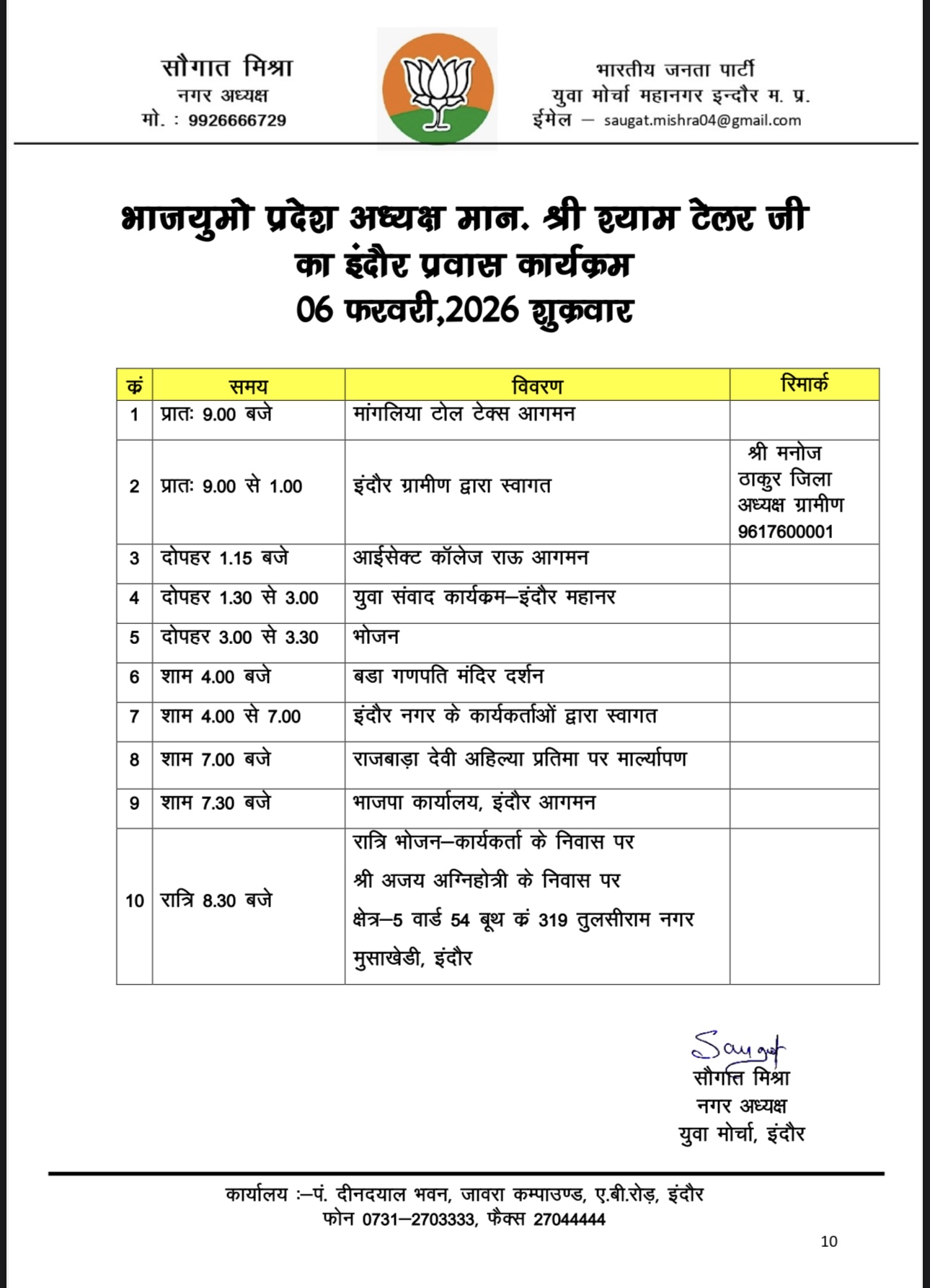 भारतीय जनता युवा मोर्चा (भाजयुमो) के प्रदेश अध्यक्ष श्याम टेलर 6 फरवरी 2026 को इंदौर के एक दिवसीय दौरे पर आ रहे हैं। इस दौरान वे कई कार्यक्रमों में शामिल होंगे और कार्यकर्ताओं से मिलेंगे।