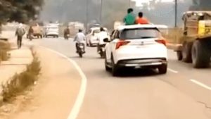 वीडियो में साफ दिख रहा है कि एक कार तेज गति से चल रही है और चालक उसे लापरवाही से लहरा भी रहा है। इसी दौरान दो बच्चे कार के सनरूफ से बाहर निकलकर बैठे हुए हैं। इस खतरनाक स्टंट के कारण किसी भी पल एक बड़ा हादसा हो सकता था, जिससे बच्चों की जान को गंभीर खतरा था।