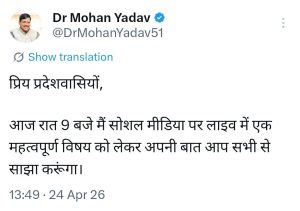 Bhopal News: मध्यप्रदेश के मुख्यमंत्री डॉ. मोहन यादव आज यानी 24 अप्रैल की रात 9 बजे अपने सोशल मीडिया प्लेटफॉर्म्स पर लाइव आएंगे। मुख्यमंत्री ने स्वयं सोशल मीडिया हैंडल (एक्स) पर पोस्ट साझा कर इसकी जानकारी दी है। उन्होंने बताया कि इस दौरान वे एक ‘महत्वपूर्ण विषय’ पर प्रदेश की जनता से सीधा संवाद करेंगे।