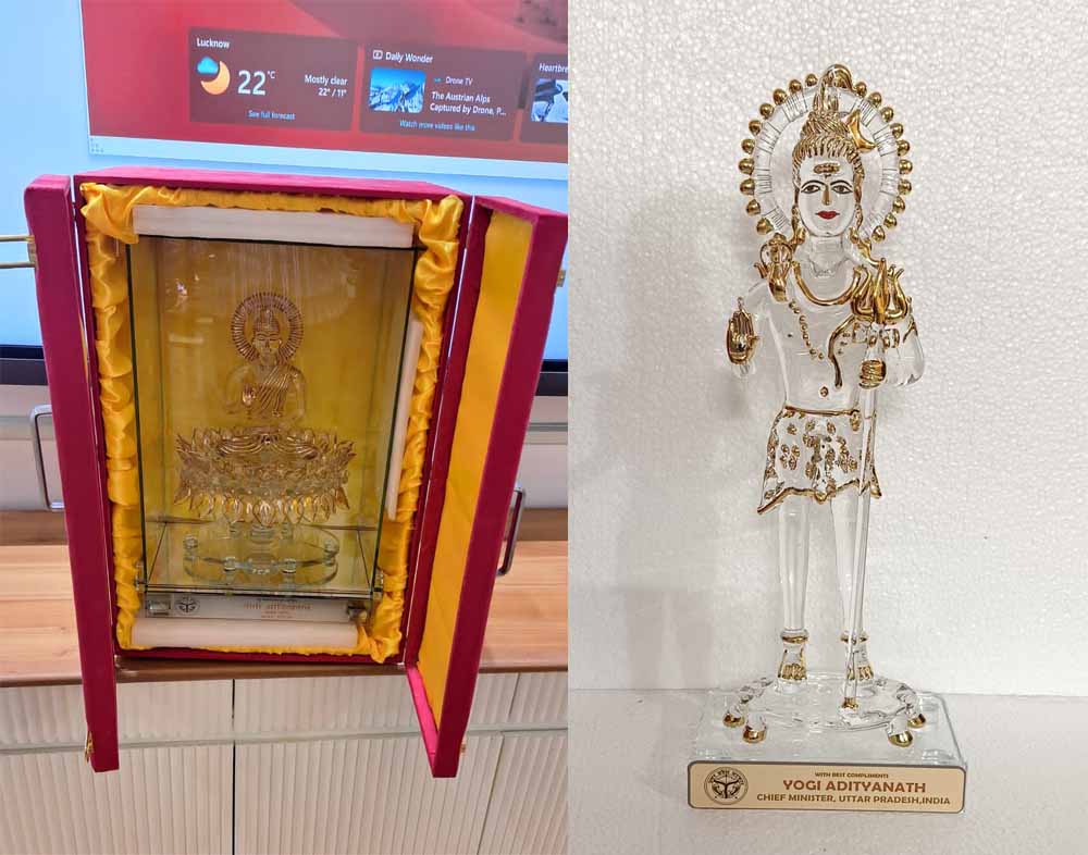 मुख्यमंत्री द्वारा दिए गए उपहारों में फिरोजाबाद से ग्लास के भगवान श्री राम, शिव, राधा-कृष्ण व बुद्ध की प्रतिमाएं शामिल रहीं, जबकि मुरादाबाद से ब्रास के शिव व बुद्ध की प्रतिमाएं, वाराणसी की मीनाकारी से बने बुद्ध व मोर और गुलाबी मीनाकारी से तैयार काशी विश्वनाथ मंदिर का मॉडल तथा सहारनपुर से लकड़ी के शिव व राधा-कृष्ण की प्रतिमाएं शामिल हैं।