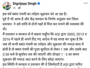 इस संवेदनशील मामले पर पूर्व मुख्यमंत्री दिग्विजय सिंह ने भी प्रतिक्रिया दी है। उन्होंने सोशल मीडिया के माध्यम से सरकार और जिला प्रशासन से संयम और संतुलन बनाए रखने का आग्रह किया है। दिग्विजय सिंह ने भारतीय पुरातत्व सर्वेक्षण (ASI) के पुराने आदेशों का हवाला दिया है। “वर्ष 2003, 2013 और 2016 में एएसआई द्वारा जारी आदेशों में यह स्पष्ट है कि जब भी बसंत पंचमी और शुक्रवार एक साथ पड़ते हैं, तब पूजा और नमाज दोनों के लिए समय का निर्धारण पहले से तय है।” — दिग्विजय सिंह, पूर्व मुख्यमंत्री