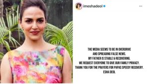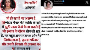 अभिनेता की बेटी ईशा देओल ने स्वास्थ्य अपडेट जारी करते हुए बताया कि उनके पिता की हालत अब स्थिर है और वह रिकवरी कर रहे हैं। इससे पहले हेमा मालिनी ने भी एयरपोर्ट पर पैपराजी से बातचीत में कहा था कि धर्मेंद्र अब ठीक हैं। परिवार के सदस्यों का अस्पताल आना-जाना लगा हुआ है और वे लगातार डॉक्टरों के संपर्क में हैं। हेमा मालिनी और बेटी ईशा देओल ने धर्मेंद्र पाजी के निधन की अफवाहों को सिरे से खारिज किया है। उन्होंने अपने सोशल मीडिया पर पोस्ट शेयर कर दिग्गज एक्टर धर्मेंद्र की तबियत के बारे में कहा है कि वे अभी ठीक हो रहे है।