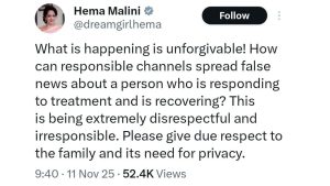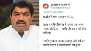 सोमवार देर शाम से दिग्गज एक्टर की तबीयत बिगड़ने के बाद अचानक से उनके निधन की अफवाहें फैलने लगी। इन सभी के बीच इंदौर के पूर्व विधायक और कांग्रेस से बीजेपी में गए संजय शुक्ला ने तेजी दिखाते हुए सोमवार रात 11.34 पर ही धर्मेंद्र के लिए श्रद्धांजलि संदेश जारी कर दिया। साथ ही कई सोशल मीडिया यूजर्स भी दिग्गज एक्टर धर्मेंद्र को श्रद्दांजलि दे रहे है। जिस पर धर्मेंद्र पाजी की पत्नी हेमा मालिनी और उनकी बेटी ईशा देओल ने सोशल मीडिया एक्स पर पोस्ट लिखकर ने नाराजगी जताई है।
