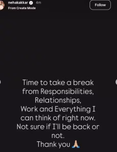 नेहा कक्कड़ ने इंस्टाग्राम पर एक भावुक पोस्ट साझा करते हुए लिखा, “अब समय आ गया है कि मैं जिम्मेदारी, रिश्तों, काम और दुनिया की बाकी चीजों से ब्रेक ले लूं। मैं नहीं जानती कि मैं दोबारा वापसी करूंगी या नहीं। इसके लिए आप सभी का शुक्रिया।”