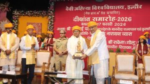 Indore News: देवी अहिल्या विश्वविद्यालय, इंदौर के दीक्षांत समारोह में राज्यपाल और कुलाधिपति मंगुभाई पटेल ने शोधार्थियों को स्वर्ण और रजत पदक प्रदान किए। विश्वविद्यालय सभागार में आयोजित कार्यक्रम में उन्होंने विद्यार्थियों से कहा कि उपाधि केवल प्रमाण-पत्र नहीं, बल्कि समाज और राष्ट्र के प्रति जिम्मेदारी का संकेत है।