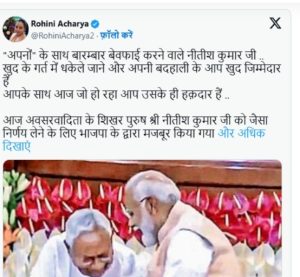 रोहिणी ने अपने पोस्ट में लिखा कि अपनों के साथ बार-बार बेवफाई करने वाले नीतीश कुमार आज जिस बदहाली के कगार पर खड़े हैं, उसके जिम्मेदार वे खुद हैं। उन्होंने नीतीश कुमार को “अवसरवादिता का शिखर पुरुष” करार देते हुए कहा कि जो आज हो रहा है, उसकी पटकथा उसी दिन (28 जनवरी, 2024) लिख दी गई थी, जब उन्होंने ‘इंडिया’ गठबंधन का साथ छोड़कर दोबारा पलटी मारी थी।