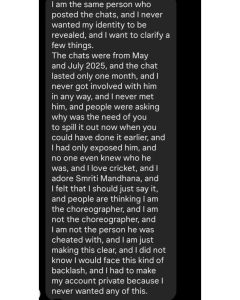 “मैं वही शख्स हूं जिसने चैट पोस्ट की थीं। मैं कभी नहीं चाहती थी कि मेरी पहचान सामने आए। मैं उनसे कभी नहीं मिली, न ही उनके साथ कभी कोई रिश्ता था। मैंने उन्हें सिर्फ इसलिए हाइलाइट किया क्योंकि मुझे क्रिकेट पसंद है, मैं स्मृति मंधाना की बहुत इज्जत करती हूं और मुझे लगा कि लोगों को पता चलना चाहिए।” — मैरी डी’कोस्टा