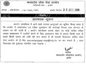 Indore News : मध्यप्रदेश लोक सेवा आयोग (MPPSC) ने अपनी आधिकारिक वेबसाइट पर एक आवश्यक सूचना जारी की है। इसमें कहा गया है कि आयोग की परीक्षा और साक्षात्कार प्रक्रिया पूरी तरह निष्पक्ष, पारदर्शी और योग्यता के आधार पर की जाती है। यदि कोई व्यक्ति परीक्षा या साक्षात्कार में सफलता दिलाने का आश्वासन देता है या इसके बदले किसी प्रकार की राशि या लाभ की मांग करता है, तो उसकी शिकायत आयोग के सचिव को ईमेल [email protected] पर भेजी जा सकती है।
