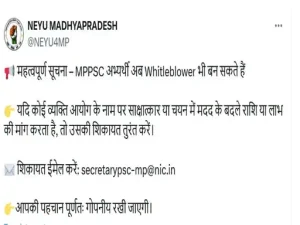 वहीं, नेशनल एजुकेटेड यूथ यूनियन (NEYU) ने इस सूचना का स्वागत करते हुए एक्स (X) पर लिखा कि “MPPSC अभ्यर्थी अब व्हिसलब्लोअर बन सकते हैं।” यूनियन ने कहा कि यदि कोई व्यक्ति आयोग के नाम पर चयन में मदद या पैसे की मांग करता है, तो उसकी तुरंत शिकायत करें। इस कदम से परीक्षा प्रक्रिया में पारदर्शिता और विश्वास और अधिक मजबूत होगा।