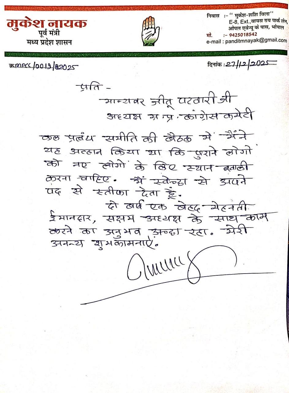 मध्य प्रदेश के वरिष्ठ कांग्रेस नेता और पूर्व मंत्री मुकेश नायक ने 27 दिसंबर 2025 को कांग्रेस मीडिया कमेटी के अध्यक्ष पद से इस्तीफा दे दिया। उन्होंने अपना इस्तीफा प्रदेश कांग्रेस अध्यक्ष जीतू पटवारी को सौंपा।
