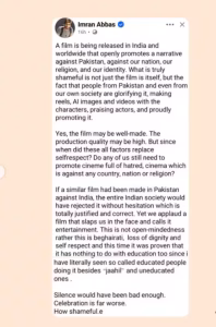 एक तरफ जहां कुछ लोग फिल्म की सिनेमेटोग्राफी और मेकिंग की तारीफ कर रहे हैं, वहीं पाकिस्तानी फिल्म इंडस्ट्री के कुछ सितारे इसे अपने देश के खिलाफ बता रहे हैं। इसी कड़ी में अब मशहूर पाकिस्तानी अभिनेता इमरान अब्बास ने फिल्म की तारीफ करने वाले पाकिस्तानियों पर तीखा हमला बोला है।