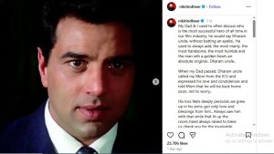 निकितिन धीर ने अपने इंस्टाग्राम पोस्ट में उस मुश्किल घड़ी को याद करते हुए लिखा, ‘जब मेरे पिताजी गुजर गए, तो धरम अंकल ने ICU से मेरी मां को फोन किया। उन्होंने अपना प्यार और संवेदना व्यक्त की और मां से कहा कि वह जल्द ही घर वापस आ जाएंगे, चिंता न करें।’