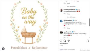 जैसे ही राजकुमार ने यह पोस्ट साझा किया, कमेंट सेक्शन में बधाइयों का तांता लग गया। फैंस से लेकर बॉलीवुड हस्तियों तक, हर कोई इस जोड़े को शुभकामनाएं दे रहा है। एक फैन ने लिखा, ‘बधाई हो राजा जी,’ जबकि एक अन्य यूजर ने लिखा, ‘बेस्ट न्यूज, आप दोनों को ढेर सारी बधाई।’
