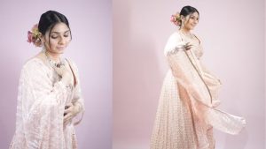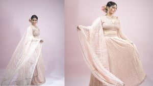 इन तस्वीरों में तनीषा मुखर्जी ने एक बेहद खूबसूरत पेस्टल रंग का लहंगा पहना है। इस लहंगे पर बारीक धागों और सीक्वेंस का काम किया गया है, जो इसे एक रिच और सोबर लुक दे रहा है। लहंगे का घेर काफी अच्छा है, जो इसे एक शाही अंदाज प्रदान करता है। इसके साथ उन्होंने मैचिंग ब्लाउज और दुपट्टा कैरी किया है, जिस पर भी लहंगे जैसा ही tinh tế काम है।