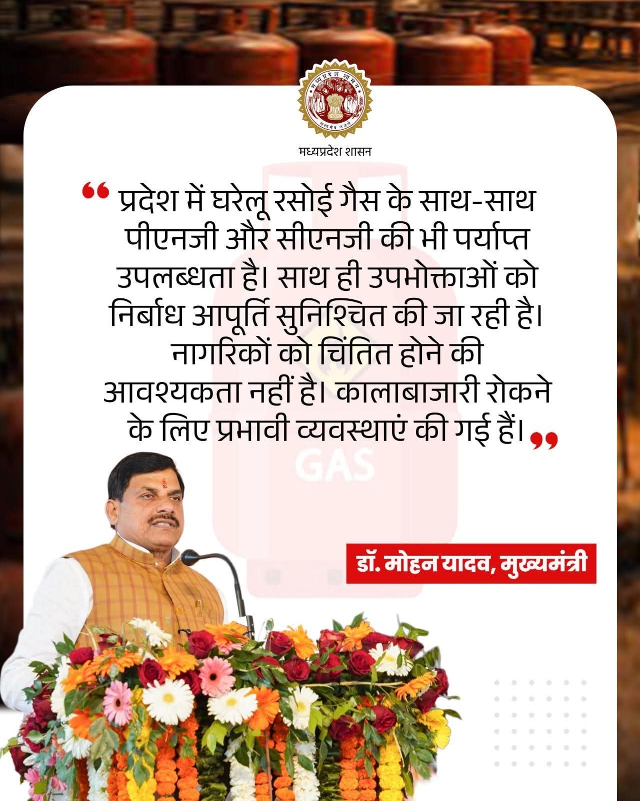 डॉ. मोहन यादव ने यह भी कहा कि गैस की कालाबाजारी और जमाखोरी पर रोक लगाने के लिए सरकार ने प्रभावी व्यवस्थाएं लागू की हैं। प्रशासन को निर्देश दिए गए हैं कि यदि कहीं भी गैस की अवैध बिक्री, अधिक कीमत वसूलने या जमाखोरी जैसी शिकायत मिलती है, तो उसके खिलाफ तुरंत कार्रवाई की जाए। सरकार का उद्देश्य यह सुनिश्चित करना है कि आम उपभोक्ताओं को उचित कीमत पर गैस उपलब्ध हो और किसी भी तरह की अनियमितता को सख्ती से रोका जा सके।