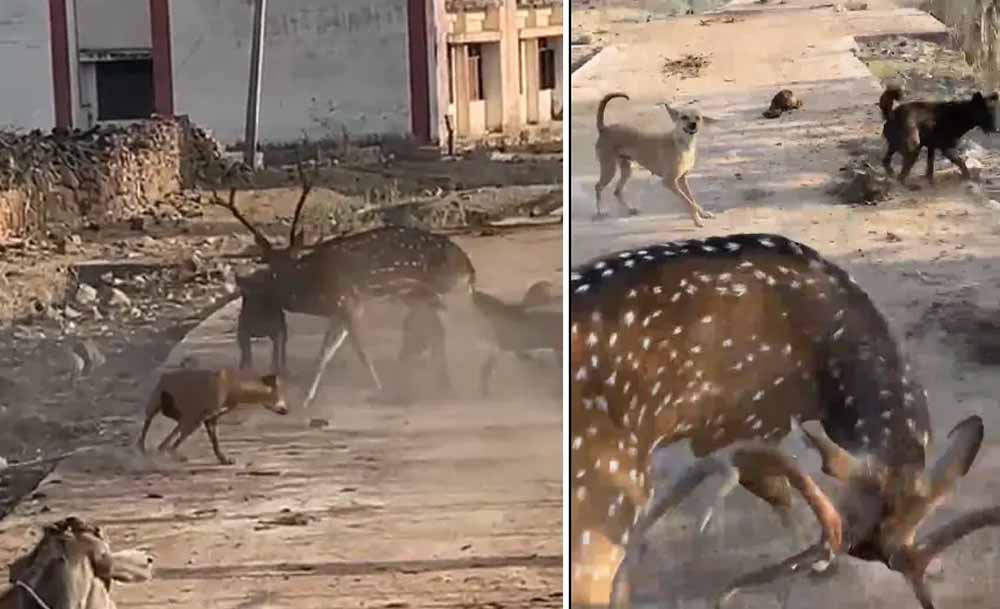 हिरण को कुत्तों से घिरा देख बच्चों ने शोर मचाया