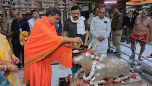 मुख्यमंत्री डॉ. साहा ने नंदी हॉल से भगवान महाकाल के दिव्य दर्शन किए। उन्होंने लगभग 10 मिनट तक गर्भगृह की देहरी से विधिवत मंत्रोच्चार के साथ पूजा की और बाबा को जल अर्पित किया। दर्शन के पश्चात महाकाल मंदिर प्रबंध समिति की ओर से उज्जैन कलेक्टर रोशन कुमार सिंह और प्रशासक मृणाल मीणा ने उन्हें स्मृति चिन्ह व प्रसाद भेंट कर सम्मानित किया।