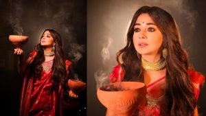 टीना दत्ता का लाल रंग की साड़ी में बंगाली पूजा के लिए कैरी किया गया ट्रेडिशनल लुक एक यादगार और खूबसूरत एंग्जापल है।