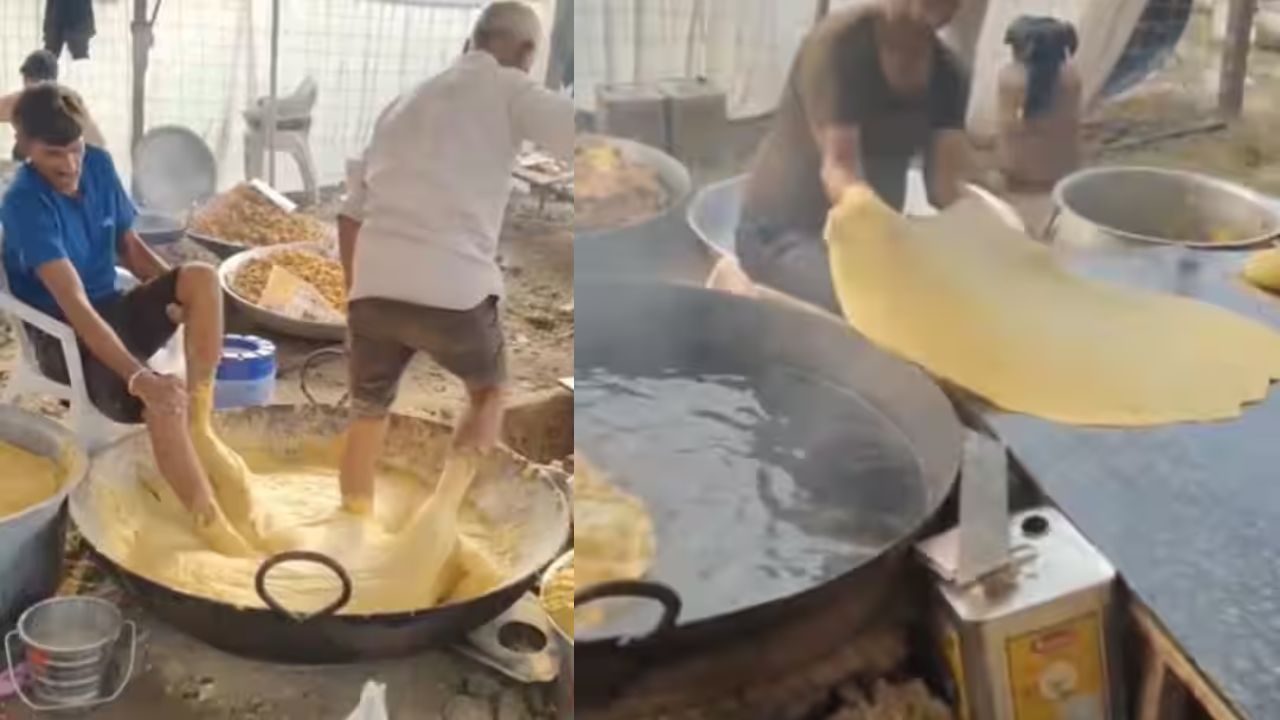 वीडियो में दिखता है कि एक बड़े से लोहे के कड़ाह में पूड़ी बनाने के लिए आटा तैयार किया जा रहा है। एक व्यक्ति आराम से कुर्सी पर बैठकर अपने पैरों से आटा मसल रहा है, जबकि दूसरा व्यक्ति उसी कड़ाह में खड़ा होकर आटा गूंथ रहा है। उनके पास ही तली जाने के लिए तैयार पूड़ियों का एक बड़ा ढेर भी दिखाई देता है।
