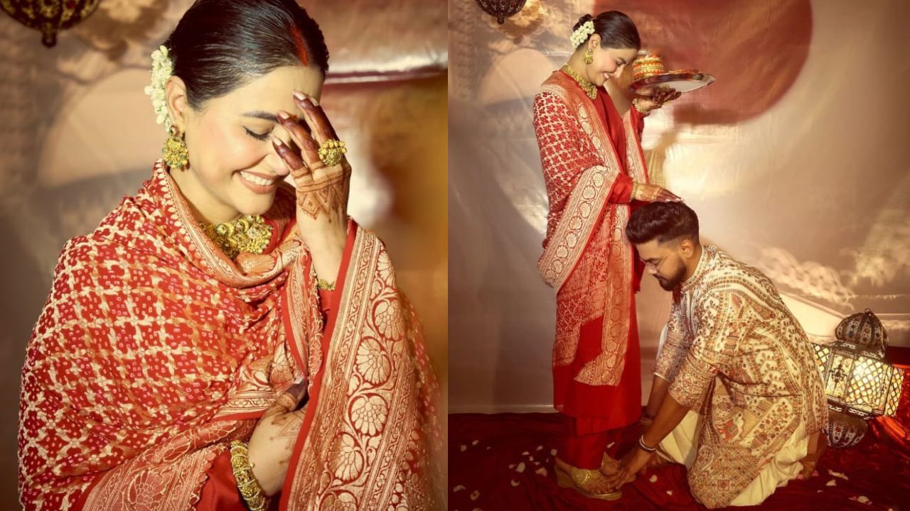 हिना ने इस दौरान एक ऐसे पोज में तस्वीरें क्लिक कराई जिस पर फैंस प्यार बरपा रहे है। एक तस्वीर में रॉकी जायसवाल हिना के पैर छु रहे है और हिना उन्हें हंसते हुए हाथ सिर पर रखते हुए आशीर्वाद दे रही है। हिना में छलनी में चांद को देखकर पति का दीदार किया।