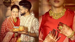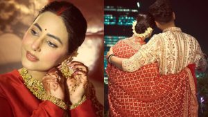 हिना ने पूरे सोलह श्रृंगार किए, रेड सूट और दुपट्टे के साथ मांग में सिंदूर लगाया। रेड सूट के साथ हिना ने भारी गोल्डन जूलरी पहनी थी। गले में नेकलेस और कानों में गोल्ड झुमके के साथ हिना बिल्कुल नई नवेली दुल्हन लग रही थीं। एक्ट्रेस ने इस खास मौके पर हाथों में मेहंदी और बालों में गजरा भी लगाया। करवा चौथ को कपल ने बहुत खुशी से सेलिब्रेट किया।