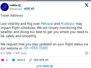 कोहरे के कारण हवाई यात्राओं पर असर पड़ रहा है। इंडिगो एयरलाइन ने अपनी एडवाइजरी में यात्रियों को सचेत किया है। एयरलाइन ने विशेष रूप से भोपाल और उदयपुर का जिक्र करते हुए कहा है कि वहां कम विजिबिलिटी और कोहरे के कारण उड़ानों के शेड्यूल पर प्रभाव पड़ सकता है।